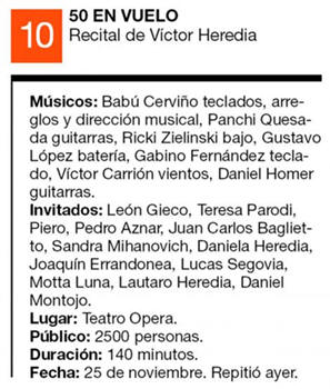 Los 50 en vuelo de Heredia comenzaron primero con la edición de dos CD en los que esa obra es celebrada junto a un amplio abanico de colegas. Varios de ellos estuvieron presentes también en el concierto del sábado (ayer repitió). El crescendo emotivo que fue el concierto alcanzó su mayor punto antes de los bises, con todos los artistas juntos entonando “Todavía cantamos”: León Gieco, Teresa Parodi, Pedro Aznar, Piero, Juan Carlos Baglietto, Sandra Mihanovich, Daniela Heredia, Joaquín Errandonea, Lucas Segovia, Motta Luna, Lautaro Heredia, Daniel Montojo, junto al anfitrión. Dos de esos invitados del disco, además, estuvieron “aunque sea como un fantasma”, según Heredia contó que pidió el primero de ellos. Silvio Rodríguez con “Mandarinas”, también las cuerdas de esa versión, y Joan Manuel Serrat con “Razón de vivir”, sonaron con sus voces grabadas sumándose a las de Heredia y a su banda.