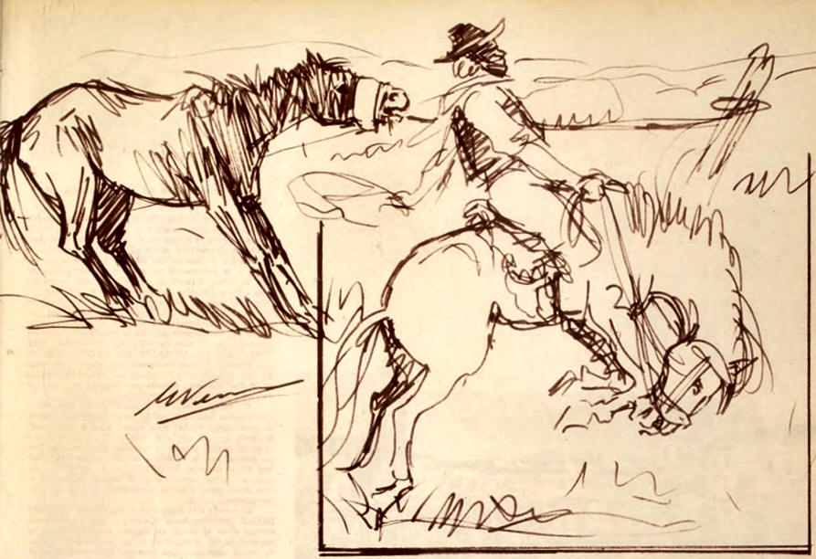 Después de encerrar la tropilla en la manguera, Floro se apeó, descolgó el lazo que traía atado a los tientos y después de armarlo y revolearlo un momento haciendo correr así a los caballos en el ancho círculo, lo arrojó y silbando fue a enroscarse en el pescuezo de un bagual que al sentir por primera vez aquello que le castigaba las carnes hasta quemárselas, relinchó lleno de miedo y con la cola levantada buscó a la carrera la salida. Floro corrió unos pasos detrás de él. con los brazos estirados sin soltar el lazo; después, por una contracción violenta los encogió, apoyó los puños en la cadera y echando para atrás resbaló un momento arrastrado por el malacara, hasta que, sujeto, éste se quedó clavado sobre sus patas mirándolo con ojos extraviados, tal vez preguntándose cómo aquel hombrecito podía dominar su salvaje vigor. En seguida el compañero de Floro, volteó al animal maneándolo. En el suelo, entre los dos lo embozalaron, le ataron fuertemente las riendas a la boca, y después de ensillado, levantado y sacado fuera, mientras lo sujetaban fuertemente tapándole a la vez un ojo con la oreja, Floro lo montó de un salto. El potro desde que lo hicieron levantar, atontado con tantas maniobras, no hacia más que arrollarse y bufar. Cuando sintió el peso de aquel hombre, al sentársele en el lomo, se arrolló más, dio un salto, y empinándose sobre las manos lanzó una formidable coz creyendo de seguro deshacerse así de aquella molestia, y como lejos de conseguirlo sintiera en seguida en los flancos los mordiscones de las espuelas y los golpes del rebenque, sacudió la cabeza entre las manos y arrollado siempre, empezó a corcovear a compás de los azotes de Floro, que firme en los estribos, ajeno al peligro, sonreía tranquilo haciendo gala del incansable poder de su brazo. Y así sin avanzar, retrocediendo a veces y corcoveando en circulo y de una manera frenética, estuvo mucho rato. Al fin la terquedad de la bestia fue vencida por la voluntad mañosa del hombre, y entonces el animal, loco de dolor, con los ojos inyectados en sangre y la desgarrada boca llena de espuma sanguinolenta, levantó la cabeza y a ver que corría delante de él el caballo que lo apadrinaba, se lanzó sin tino en una carrera vertiginosa, hostigado siempre por el rebenque y las espuelas. Una hora después los dos jinetes volvían, Floro detrás en el bagual a quien seguía castigando y tironeando con fuerza de las riendas. Cuando llegaron cerca de la casa, lo desensillaron y atado a un fuerte cabestro vencido, cubierto de sudor y con las carnes palpitantes el pobre animal iba a pasar su primera noche de esclavitud junto al palenque, soñando tal vez con su querida libertad que tan injustamente la arrebataban. |