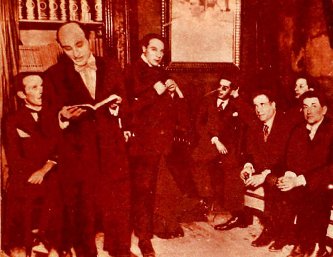 El autor de "Partituras secretas" leyendo sus poemas en una reunión a la que asisten Eugenio D'Ors, Cúneo, Dieste, Furest Muñoz, Montero y Parra del Riego |