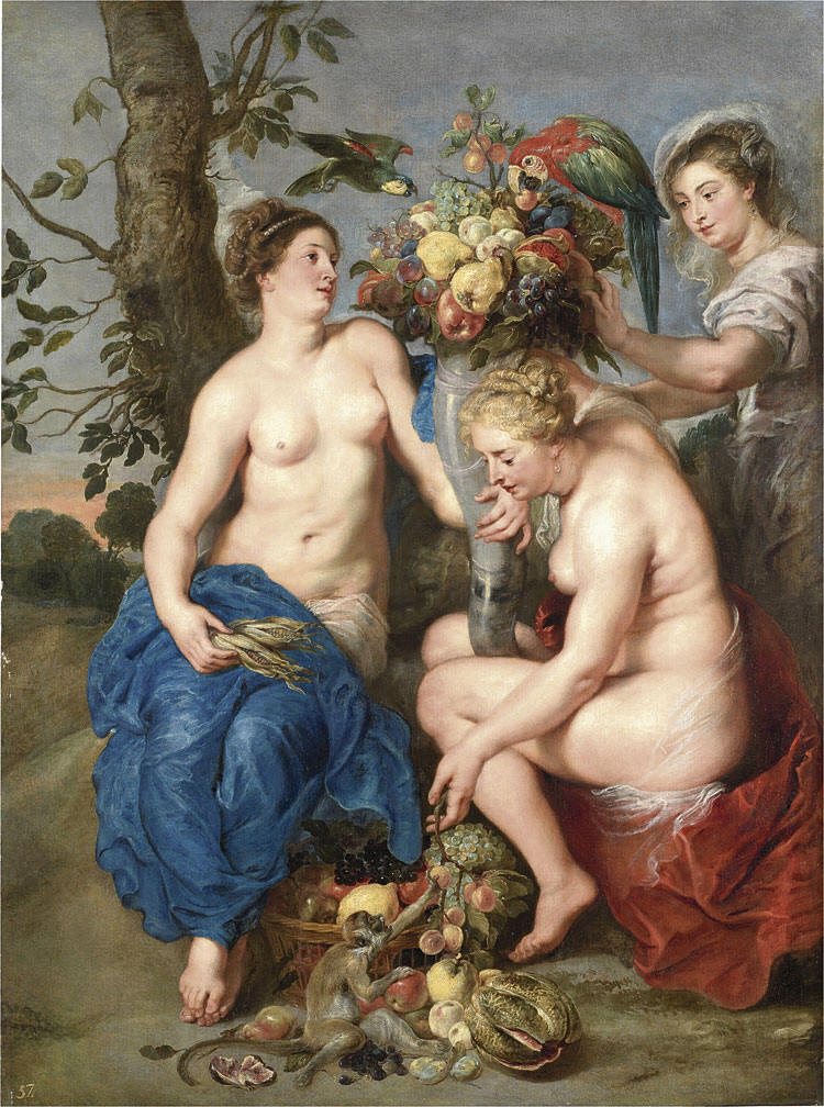 las hijas de Pandión por el palacio. las griegas, ven con plumas sustentarse, y Filomena, en ruiseñor mudada, se fue a la selva por llorar su afrenta: mas Progne, transformada en golondrina, en la más alta torre hizo su nido, y hoy día tiene el pecho señalado con la bermeja sangre del muerto Itis... Comparando este asunto con el de los amores de Pomona y Vertumno, henchido de gracia primaveral, vemos que Rubens anima igualmente lo risueño y lo trágico, y vuelven a nuestro ánimo el nombre de Shakespeare, el de Lope. Como narrador, Rubens tiene pocos rivales. Al cumplir sus encargos da gusto a su fantasía, satisface la tendencia de su ingenio más adecuada a los temas que se le brindan. Pero tiene, ante todo, el interés de su pintura. Sólo que aquí el asunto, derivado de fuentes literarias y necesitando, para su comprensión cabal, de algún comentario, sobre todo en casos como el de la historia de Progne y Tereo, pasa casi siempre a primer término. Para la contemplación de un Rubens quieto, triunfador con toda la fuerza de su paleta, volvamos a las Diosas, volvamos a las Gracias. |