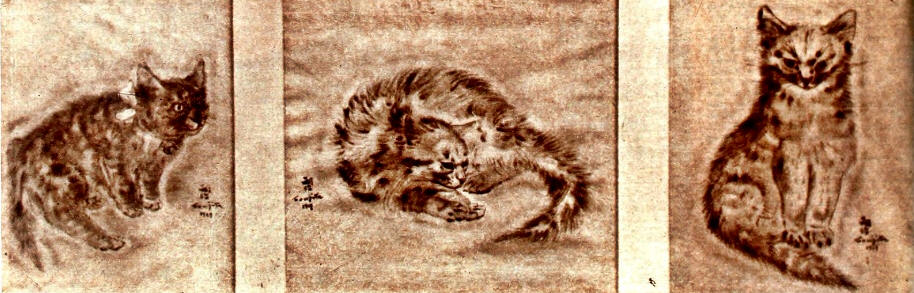 Dos o tres obras nos lo dan primero en su oriental finura heredada de sus antepasados y luego traída a más cerca nuestro, en esos dibujos de “Gatos", en los que puede verse con tanta verdad una gama de recursos de firme extensión, su línea, el aguado, un detalle expresado magníficamente en la piel de los animales, con elementos plásticos innegables. Después sus dibujos de mujeres: esas cabezas muy parecidas a las del moderno francés. Líneas solas y muy limitadas en la sintética expresión; líneas escorzadas, siguiendo la intención del arabesco simple y justo. En otra de sus formas de manifestarse, la hallamos en la perfección y el detalle; ayudado con una pintura diluida, llena de tal realismo en la ejecución, que aflora de ella el volumen y el espacio atmosférico con atisbos asombrosos. Y para completar la exposición, un cuadro representando un baile de disfraz al gouache, y entrando en materia más dejada al imprevisto y al efecto de manchas, sin la neta seguridad de su verdadera manera, la que sin duda por suerte, aunque en pocas obras, se la puede palpar. |