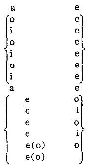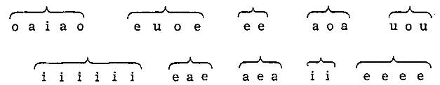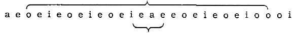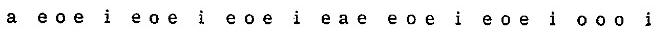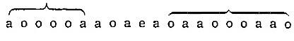 que está integrado por otros dos grupos simétricos: a o o a, ligados a su vez por la pequeña simetría a a cuyo eje coincide con el del poema. Esa asonancia interna es, pues, mucho más estricta que la de los acentos en séptima, más importantes y que parecen estar abandonados a la facilidad de su asonancia impar y aguda. No hay tal: estos últimos, sin llegar a constituir una línea tan perfecta, forman los tres grupos simétricos eslabonados que indican las llaves, y un examen más detallado demuestra todavía que los acentos en séptima, combinándose con los primeros, integran una simetría mayor: la total simetría del poema. Si ordenamos las vocales tónicas en el espacio para remedar su orden en el tiempo, obtenemos una línea mayor centrada en la e, esa e que estaba solitaria y como fuera de lugar entre las aes y oes del borde.