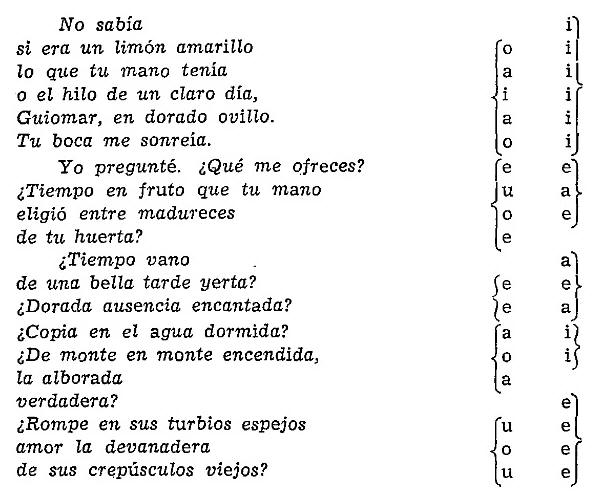Tiene tanta importancia la simetría vertical, que es un fenómeno del tipo de la rima, como la horizontal que da el fluir del poema y está más cerca de los dominios del ritmo. Lo fundamental de la coexistencia de ambas formas en un armazón rítmico, en una estructura compleja privativa de esta pieza y causa, hasta cierto unto, de su encanto. Otro poema más ejemplar aún, ya que carece de las repeticiones que podían influir en la simetría del anterior, es la primera de las Canciones a Guiomar[3]. Sus octosílabos narran, dudan o precintan coloquial, caprichosamente, y el único rigor es, en las apariencias, el de la rima, por otra parte también caprichosa en sus combinaciones. Sin embargo, de nuevo, con sólo destacar los acentos, aparecen limpios grupos simétricos verticales que en un solo caso (segunda estrofa) se deslucen por un cambio de u por o. La situación canjeable en español de estas dos vocales resta importancia a dicho cambio. Todas las demás simetrías son perfectas.