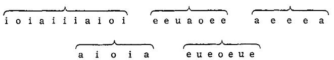 de tan perfecta simetría que no pueden quedar dudas acerca del sentido y de la función que tienen en el poema. La exposición sucesiva de las vocales acentuadas, su ordenamiento, da otros grupos distintos, es natural, pero igualmente simétricos, que separan en el poema el primer planteo de las preguntas, y las preguntas entre sí.